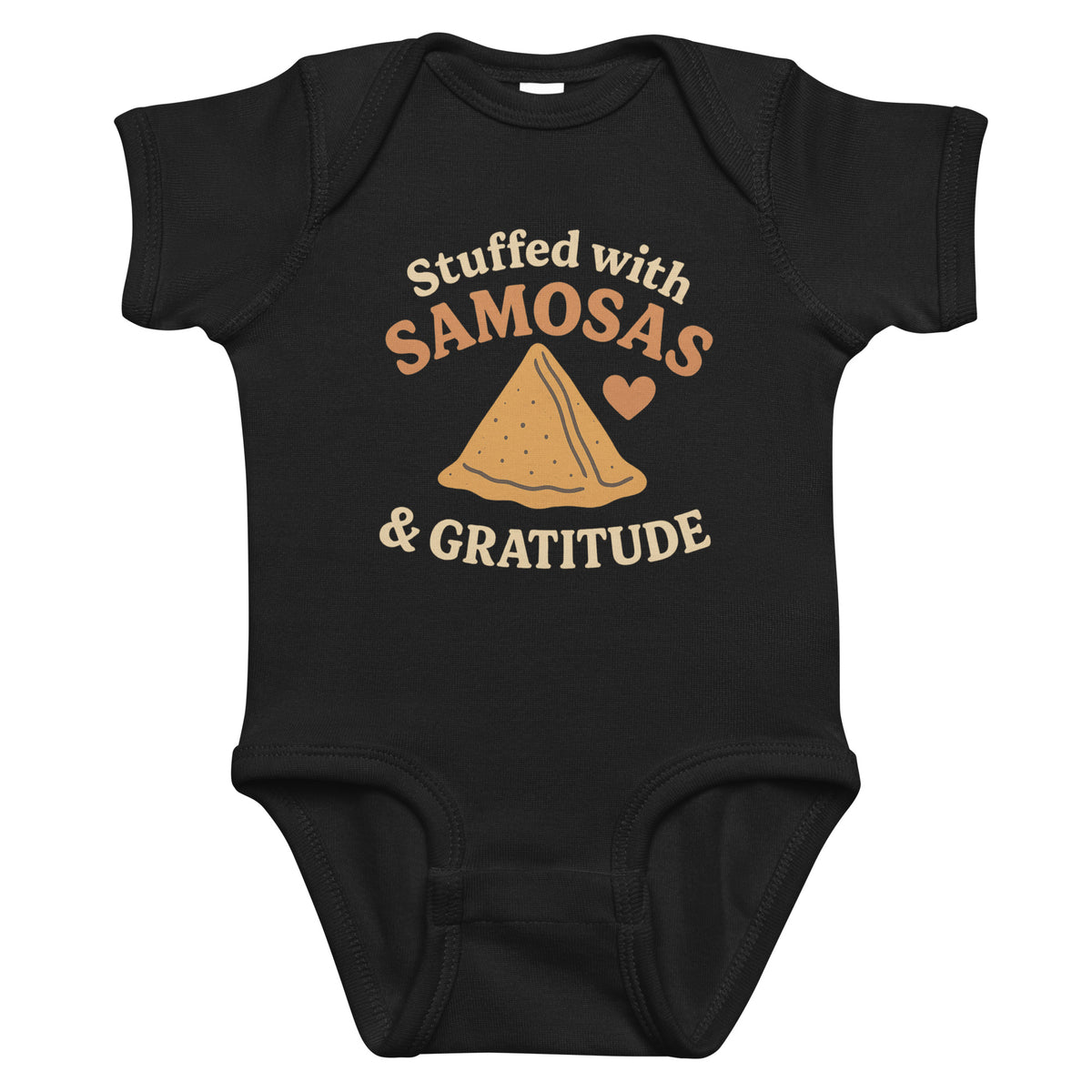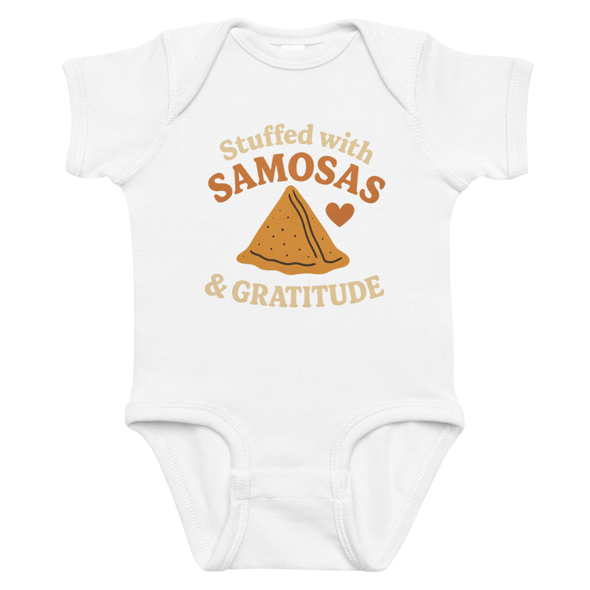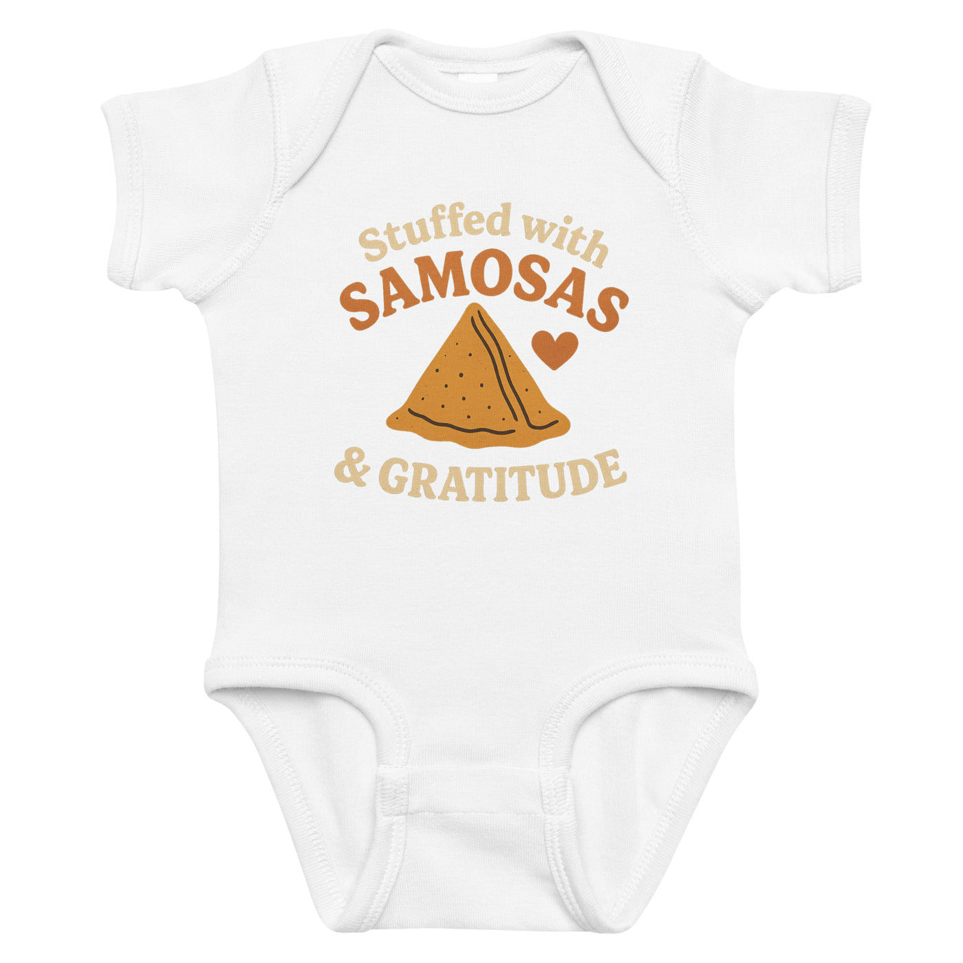 Dress your little one in cuteness and culture with our Stuffed with Samosas & Gratitude Baby Bodysuit — the perfect holiday outfit for tiny foodies and thankful families. This funny and festive baby bodysuit is ideal for Thanksgiving photos, holiday gatherings, and cozy winter days. With its adorable desi-inspired message, it adds humor and heart to your baby’s wardrobe — and makes the sweetest statement for families who love Indian food and culture.